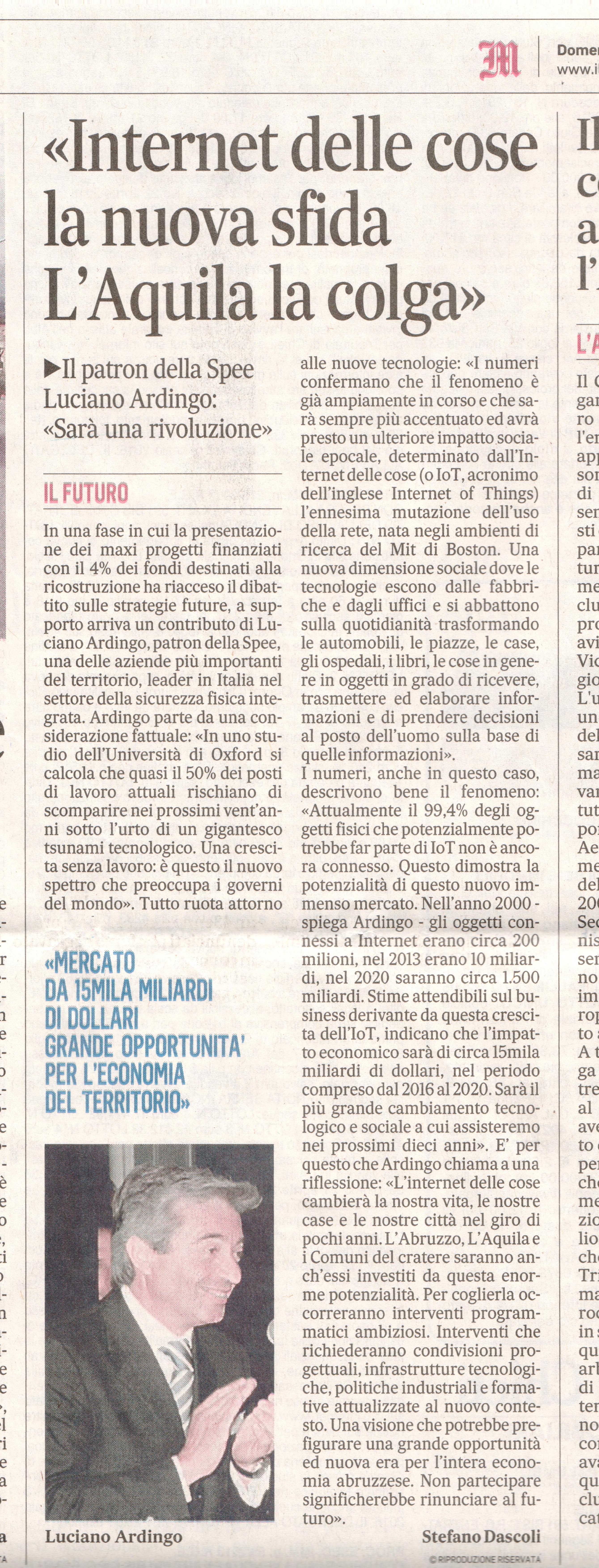 E' per questo che Ardingo chiama a una riflessione: «L'Internet delle Cose cambierà la nostra vita, le nostre case e le nostre città nel giro di pochi anni. L'Abruzzo, L'Aquila e i comuni dei crateri saranno anch'essi investiti da questa enorme potenzialità. Per coglierla occorreranno interventi programmatici ambiziosi. Interventi che richiederanno condivisioni progettuali, infrastrutture tecnologiche, politiche industriali e formative attualizzate al nuovo contesto. Una visione che potrebbe prefigurare una grande opportunità ed una nuova era per l'intera economia abruzzese.